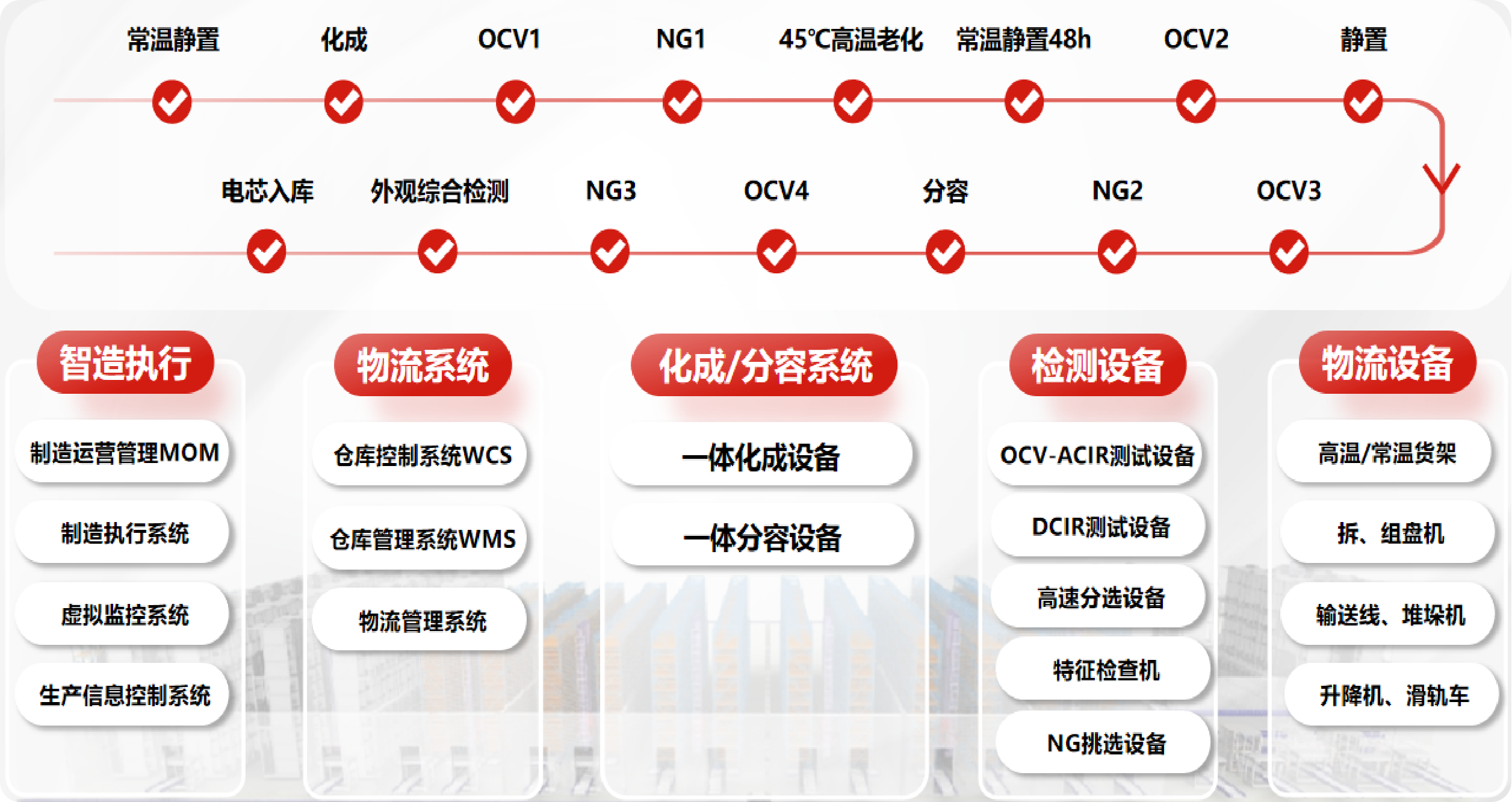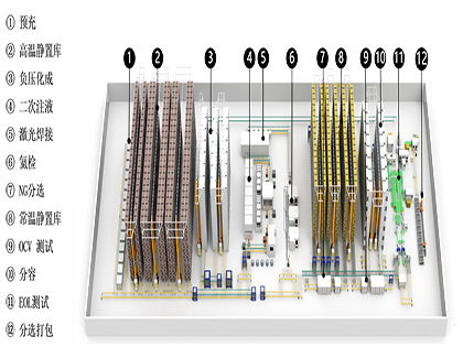 圆柱锂电池后处理智能系统是综合了锂电池生产测试设备、仓储物流设备和计算机管理控制系统实现锂电池自动充放电、OCV/IR、DCIR测试、分选、电池静置和物流搬运等过程,该系统依托“锂电池自动生产系统”、“生产管理子系统”、“物流管理子系统”和“安全防护子系统”从而保证整体生产系统实现可控、精准、安全、稳定、灵活、高效等特点。
