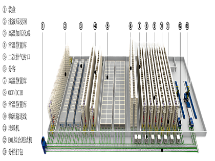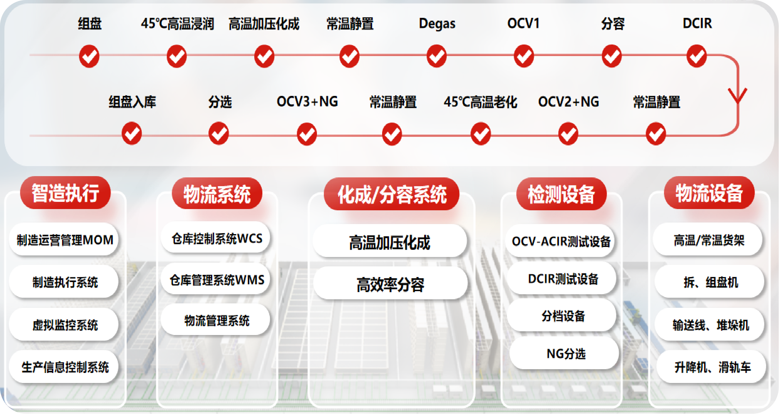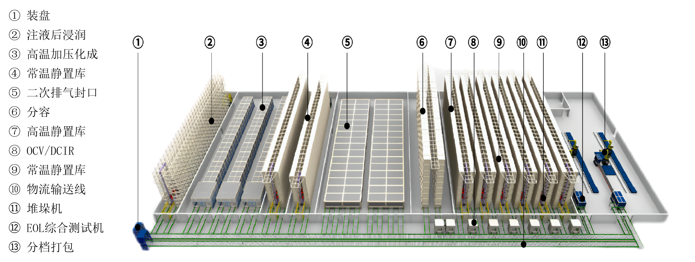 固态电池后处理智能系统是综合了高温加压化成设备、固态电池生产测试设备、仓储物流设备和计算机管理控制系统实现锂电池自动充放电、OCV/IR、DCIR测试、分选、电池静置和物流搬运等过程,该系统依托“锂电池自动生产系统”、“生产管理子系统”、“物流管理子系统”和“安全防护子系统”从而保证整体生产系统实现可控、精准、安全、稳定、灵活、高效等特点。