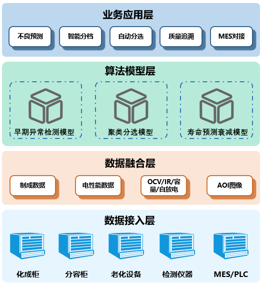 本预测系统平台对接MES或FMS系统对接,链接电池产线全工序数据,结合电池机理、大数据、AI算法模型等技术对产线数据进行深度挖掘,提供各种类型的电池评分和诊断模型,为产线降本,增效,提质。