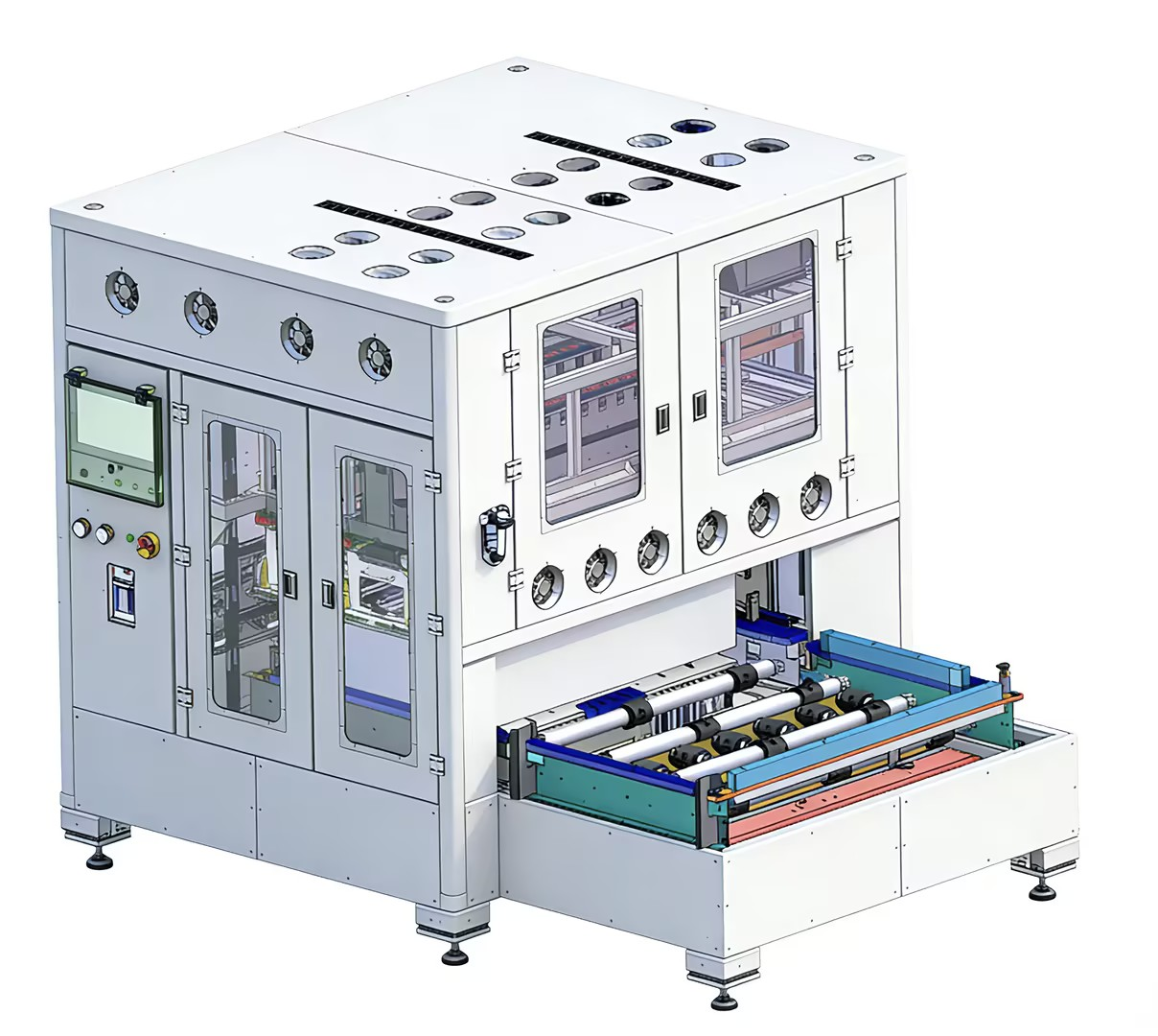 DCIR测试设备主要由自动上料对接机构、电池扫码机构、电池直流内阻测试电源,测试压床组成,可自动完成与输送线的交互,读取WCS的托盘信息,完成铝壳储能电池的高频直流内阻测试,并自动存储测试数据与上传MES系统。
