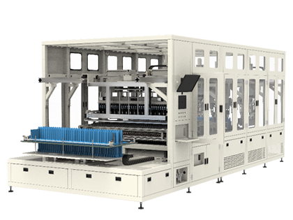 均匀打开拘束隔板→电池上料→电池上料整定→天车机械手抓取36块电池→