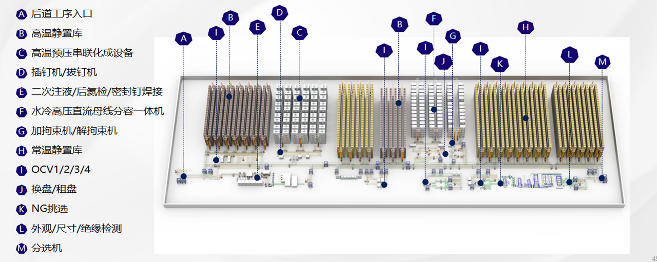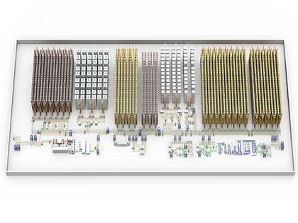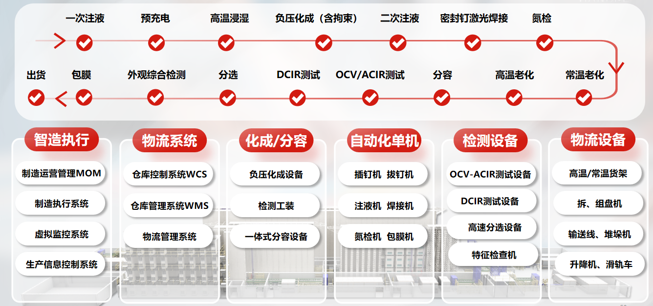 方形锂电池后处理智能系统集智造执行系统、物流系统、物流设备、化成分容、检测、单机设备于一体,全力打造高安全智能化后处理系统,实现“系统个性化、设计协同化、供应敏捷化、制造柔性化、服务主动化、决策智能化”的系统目标。